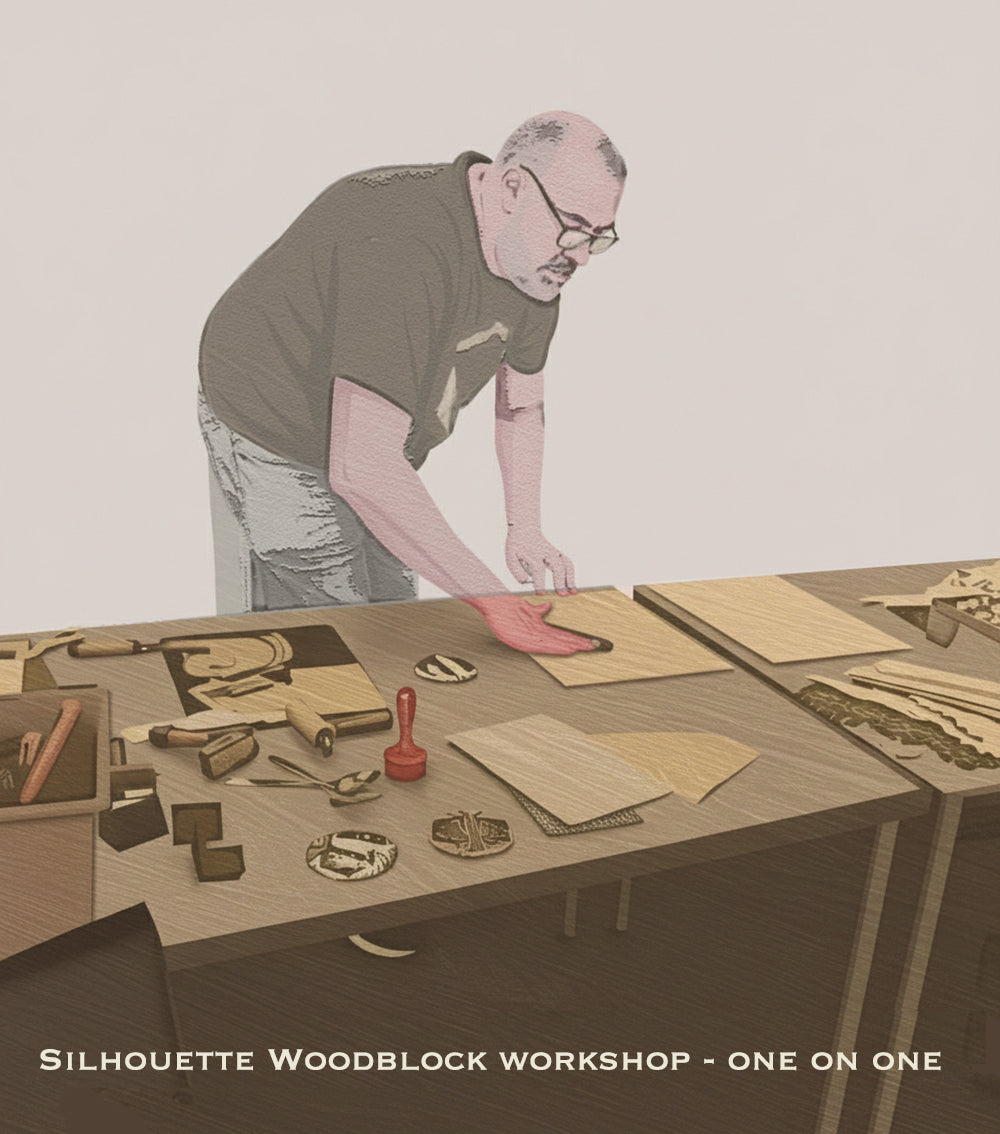 This one-on-one intensive introduces you to the bold and expressive art of silhouette woodblock printing. Over two hours you’ll create organic-shaped silhouettes that can be printed in black and white or colour, and layered over textured background prints to build dynamic, multi-layered compositions.
